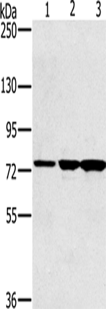 Western Blot analysis of Human testis tissue, Jurkat cell and Mouse liver tissue using KIRREL2 Polyclonal Antibody at dilution of 1:500