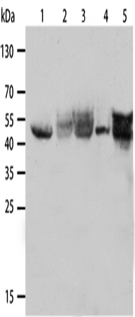 Western Blot analysis of A431, Hela and Lovo cell, Human fetal lung and adult liver tissue using CK-19 Polyclonal Antibody at dilution of 1:1000