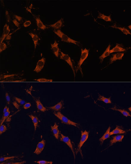 Immunofluorescence analysis of C6 cells using KSR1 Polyclonal Antibody at dilution of 1:100 (40x lens). Blue: DAPI for nuclear staining.