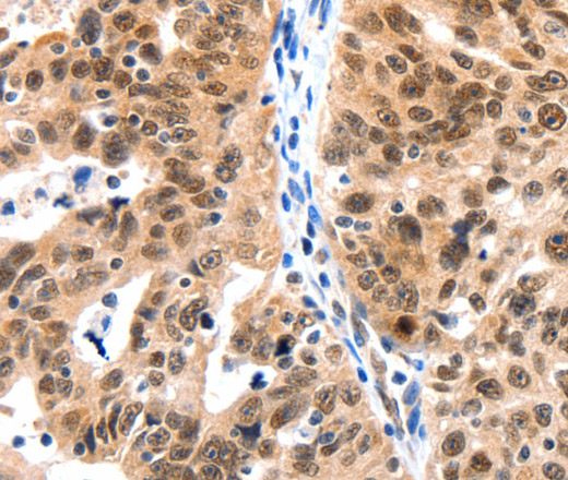 Immunohistochemistry of paraffin-embedded Human ovarian cancer tissue using LRP5 Polyclonal Antibody at dilution 1:115