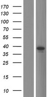 Western blot validation of overexpression lysate (Cat# LY400421) using anti-DDK antibody (Cat# TA50011-100). Left: Cell lysates from un-transfected HEK293T cells; Right: Cell lysates from HEK293T cells transfected with RC208251 using transfection reagent MegaTran 2.0 (Cat# TT210002).