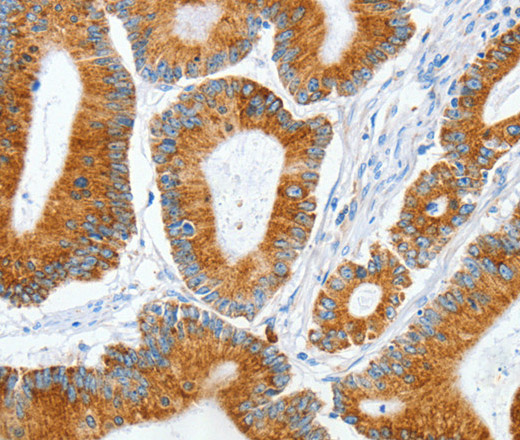 Immunohistochemistry of paraffin-embedded Human colon cancer tissue using MANF Polyclonal Antibody at dilution 1:50