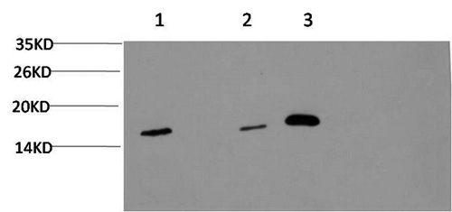 Western Blot analysis of 1) Hela, 2) 3T3, 3) Rat brain using MAP1LC3A Monoclonal Antibody at dilution of 1:1000.