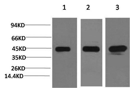 Western Blot analysis of 1) Hela, 2) 3T3, 3) Rat brain using MAP2K2 Monoclonal Antibody at dilution of 1:2000.
