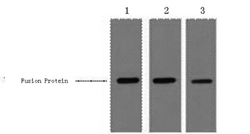 Western Blot analysis of 0.5ug MBP fusion protein using MBP-Tag Monoclonal Antibody at dilution of 1) 1:3000 2) 1:5000 3) 1:10000.