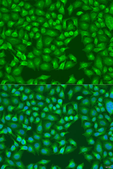 Immunofluorescence analysis of U2OS cells using MERTK Polyclonal Antibody at dilution of 1:100. Blue: DAPI for nuclear staining.