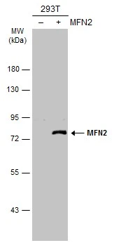 ![Non-transfected (–) and transfected (+) 293T whole cell extracts (30 μg) were separated by 7.5% SDS-PAGE, and the membrane was blotted with MFN2 antibody [N1N2], N-term (GTX102055) diluted at 1:1000. The HRP-conjugated anti-rabbit IgG antibody (GTX213110-01) was used to detect the primary antibody. Non-transfected (–) and transfected (+) 293T whole cell extracts (30 μg) were separated by 7.5% SDS-PAGE, and the membrane was blotted with MFN2 antibody [N1N2], N-term (GTX102055) diluted at 1:1000. The HRP-conjugated anti-rabbit IgG antibody (GTX213110-01) was used to detect the primary antibody.](https://www.genetex.com/upload/website/prouct_img/normal/GTX102055/GTX102055_40541_20171117_WB_B_w_23060100_523.webp)
