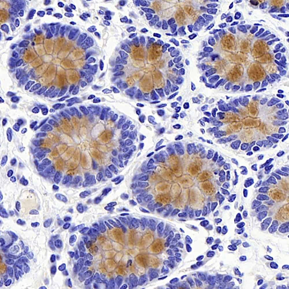 Immunohistochemistry analysis of paraffin-embedded human colon using MUC2 Polyclonal Antibody at dilution of 1:600.