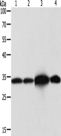 Western Blot analysis of Hela and Jurkat cell, Mouse brain tissue and 293T cell using NAPA Polyclonal Antibody at dilution of 1:500