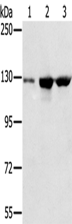 Western Blot analysis of A549, K562 and hela cell using NAT10 Polyclonal Antibody at dilution of 1:200