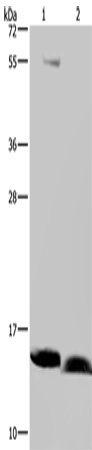 Western Blot analysis of Human bladder carcinoma and fetal brain tissue using NDUFA5 Polyclonal Antibody at dilution of 1:400