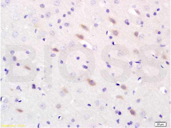 Formalin-fixed and paraffin-embedded : rat brain labeled with Rabbit Anti-NOS-2/iNOS Polyclonal Antibody, Unconjugated(bs-2072R) 1:200 followed by conjugation to the secondary antibody and DAB staining