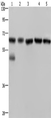 Western Blot analysis of Jurkat cell and Human brain malignant glioma tissue, PC3, K562 and A549 cell using NUP62 Polyclonal Antibody at dilution of 1:300