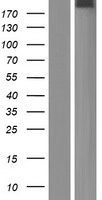 Western blot validation of overexpression lysate (Cat# LY406496) using anti-DDK antibody (Cat# TA50011-100). Left: Cell lysates from un-transfected HEK293T cells; Right: Cell lysates from HEK293T cells transfected with RC212026 using transfection reagent MegaTran 2.0 (Cat# TT210002).