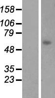 Western blot validation of overexpression lysate (Cat# LY413912) using anti-DDK antibody (Cat# TA50011-100). Left: Cell lysates from un-transfected HEK293T cells; Right: Cell lysates from HEK293T cells transfected with RC204370 using transfection reagent MegaTran 2.0 (Cat# TT210002).