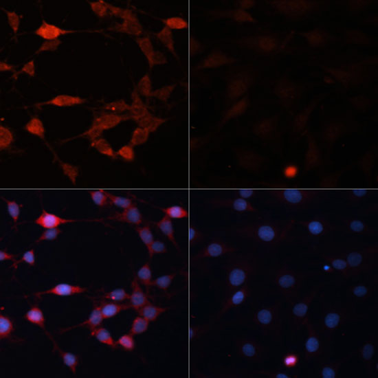Immunofluorescence analysis of C6 cells using P70 S6K Polyclonal Antibody at dilution of 1:100.C6 cells were treated by Serum-starvation overnight at 37°C. Blue: DAPI for nuclear staining.