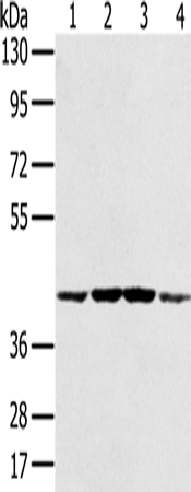 Western Blot analysis of Hela, K562, Raji and Jurkat cell using PAICS Polyclonal Antibody at dilution of 1:550