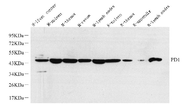 Western Blot analysis of various samples using PD-1/CD279 Polyclonal Antibody at dilution of 1:1000.