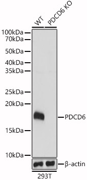 Western blot analysis of extracts from wild type(WT) and PDCD6 knockout (KO) 293T(KO) cells using PDCD6 Polyclonal Antibody at 1:1000 dilution.