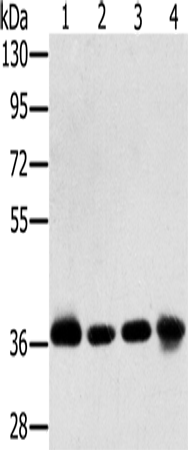 Western Blot analysis of Huvec and 293T cell, hepg2 cell and Mouse liver tissue using CLP36 Polyclonal Antibody at dilution of 1:600