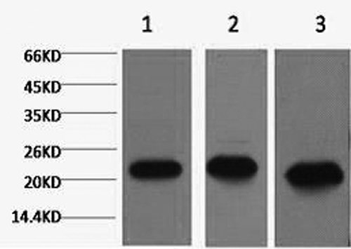Western Blot analysis of 1) MCF7, 2) Rat kidney, 3) Mouse brain using PRDX1 Monoclonal Antibody at dilution of 1:2000.