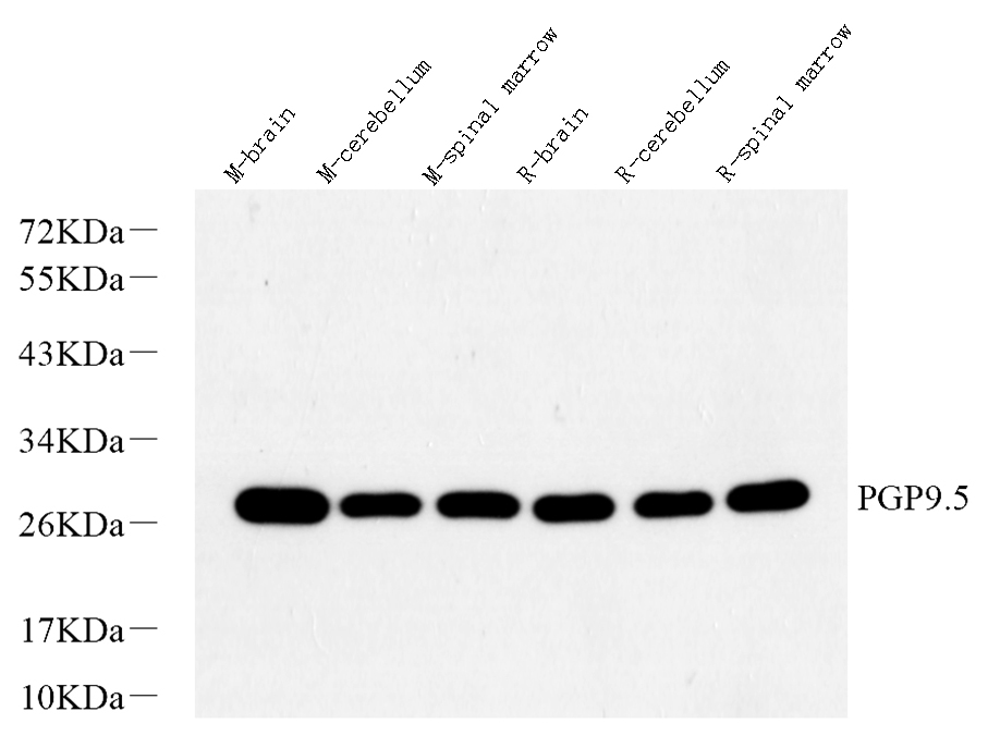 Western Blot analysis of various samples using PGP 9.5 Polyclonal Antibody at dilution of 1:1000.