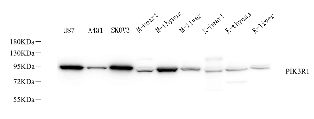 Western Blot analysis of various samples using PI 3 kinase p85 alpha Polyclonal Antibody at dilution of 1:1000.
