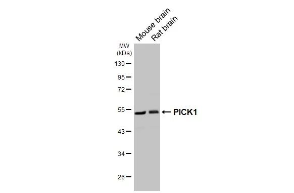 ![Various tissue extracts (50 μg) were separated by 10% SDS-PAGE, and the membrane was blotted with PICK1 antibody [GT32] (GTX641124) diluted at 1:1000. The HRP-conjugated anti-mouse IgG antibody (GTX213111-01) was used to detect the primary antibody. Various tissue extracts (50 μg) were separated by 10% SDS-PAGE, and the membrane was blotted with PICK1 antibody [GT32] (GTX641124) diluted at 1:1000. The HRP-conjugated anti-mouse IgG antibody (GTX213111-01) was used to detect the primary antibody.](https://www.genetex.com/upload/website/prouct_img/normal/GTX641124/GTX641124_45558_20241011_WB_M_R_24101600_518.webp)