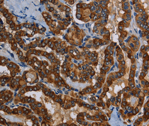 Immunohistochemistry of paraffin-embedded Human thyroid cancer tissue using PIDD1 Polyclonal Antibody at dilution 1:50