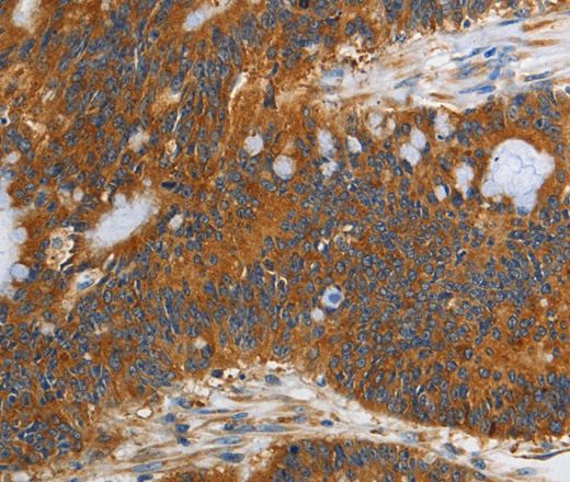 Immunohistochemistry of paraffin-embedded Human colon cancer tissue using PI 3 Kinase Class 3 Polyclonal Antibody at dilution 1:40