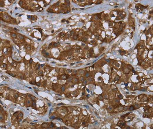 Immunohistochemistry of paraffin-embedded Human breast cancer tissue using PIP Polyclonal Antibody at dilution 1:50