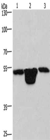 Western Blot analysis of Hela cell, Mouse muscle and kidney tissue using PLEKHO1 Polyclonal Antibody at dilution of 1:200