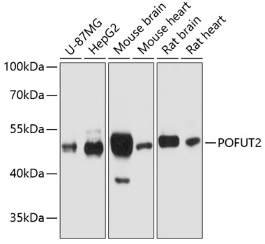Western blot analysis of extracts of various cell lines using POFUT2 Polyclonal Antibody at dilution of 1:1000.