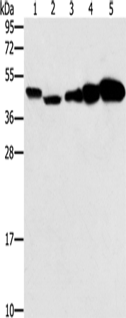 Western Blot analysis of Hela, Raji, Jurkat, A549 and NIH/3T3 cell using PPAT Polyclonal Antibody at dilution of 1:250