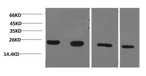 Western Blot analysis of 1) Jurkat, 2)293T, 3)Rat liver, 4)3T3 using PPIB Monoclonal Antibody at dilution of 1:2000.