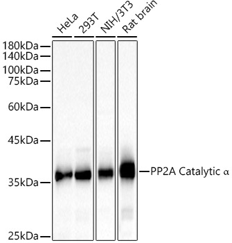 Western blot analysis of various lysates using PP2A Catalytic alpha Polyclonal Antibody at 1:2000 dilution.