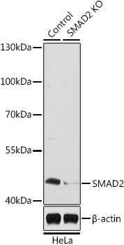 Western blot analysis of extracts from normal (control) and SMAD2 knockout (KO) HeLa cells using SMAD2 Polyclonal Antibody at dilution of 1:1000.