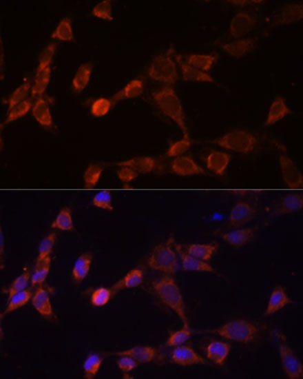 Immunofluorescence analysis of NIH-3T3 cells using PSMD14 Polyclonal Antibody at dilution of 1:100 (40x lens). Blue: DAPI for nuclear staining.
