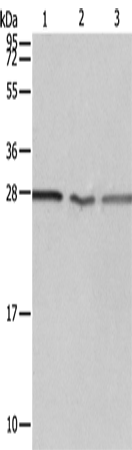 Western Blot analysis of Jurkat, A549 cell and Human fetal kidney tissue using PSMD9 Polyclonal Antibody at dilution of 1:750