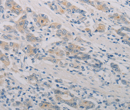 Immunohistochemistry of paraffin-embedded Human gasrtic cancer tissue using PTAFR Polyclonal Antibody at dilution 1:70