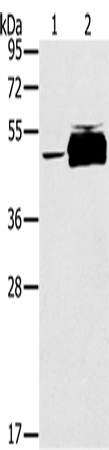 Western Blot analysis of K562 cell and Human testis tissue using PTPN20 Polyclonal Antibody at dilution of 1:200