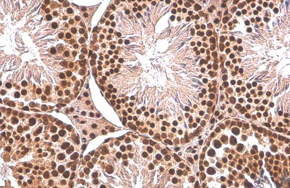 PUF60 antibody [GT917] detects PUF60 protein at nucleus by immunohistochemical analysis. Sample: Paraffin-embedded mouse testis. PUF60 stained by PUF60 antibody [GT917] (GTX629887) diluted at 1:200. Antigen Retrieval: Citrate buffer, pH 6.0, 15 min