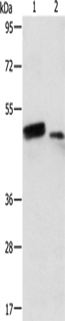 Western Blot analysis of Human liver cancer and normal liver tissue using RARB Polyclonal Antibody at dilution of 1:500