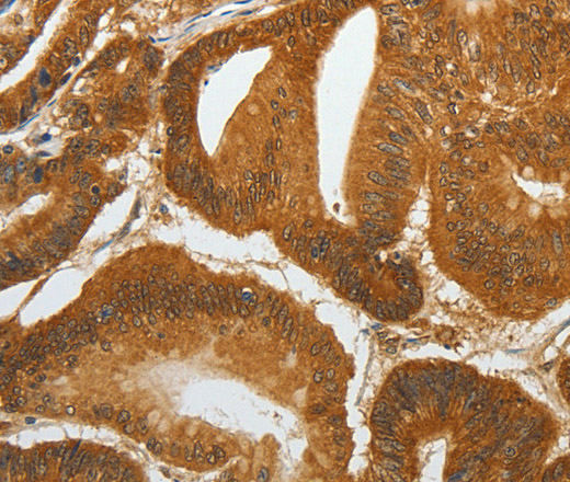 Immunohistochemistry of paraffin-embedded Human colon cancer tissue using RETNLB Polyclonal Antibody at dilution 1:40