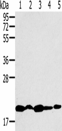 Western Blot analysis of K562, 231, Jurkat, hela and 293T cell using RNF5 Polyclonal Antibody at dilution of 1:200