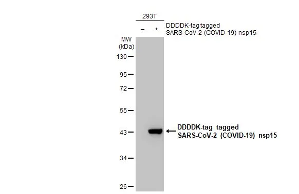 Non-transfected (–) and transfected (+) 293T whole cell extracts (30 μg) were separated by 10% SDS-PAGE, and the membrane was blotted with SARS-CoV-2 (COVID-19) nsp15 antibody [HL1445] (GTX636917) diluted at 1:1000. The HRP-conjugated anti-rabbit IgG antibody (GTX213110-01) was used to detect the primary antibody.