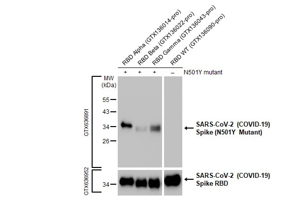 ![Various SARS-CoV-2 (COVID-19) Spike RBD Proteins (0.1 μg) were separated by 12% SDS-PAGE, and the membrane was blotted with SARS-CoV-2 (COVID-19) Spike (N501Y Mutant) antibody [HL1425] (GTX636891) diluted at 1:5000. The HRP-conjugated anti-rabbit IgG antibody (GTX213110-01) was used to detect the primary antibody. Various SARS-CoV-2 (COVID-19) Spike RBD Proteins (0.1 μg) were separated by 12% SDS-PAGE, and the membrane was blotted with SARS-CoV-2 (COVID-19) Spike (N501Y Mutant) antibody [HL1425] (GTX636891) diluted at 1:5000. The HRP-conjugated anti-rabbit IgG antibody (GTX213110-01) was used to detect the primary antibody.](https://www.genetex.com/upload/website/prouct_img/normal/GTX636891/GTX636891_T-44627_20220624_WB_SARSCoronavirus2_Ag_22062919_148.webp)