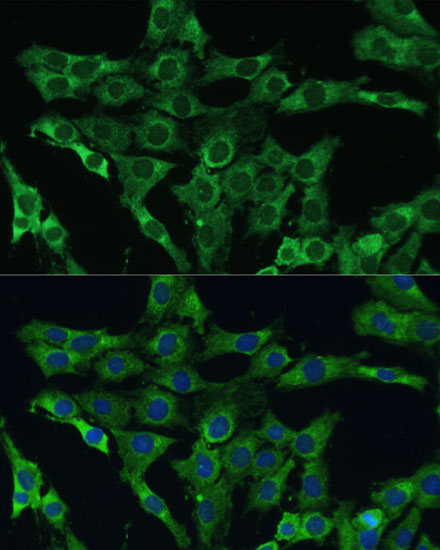 Immunofluorescence analysis of C6 cells using PLSCR3 Polyclonal Antibody at dilution of 1:100 (40x lens). Blue: DAPI for nuclear staining.