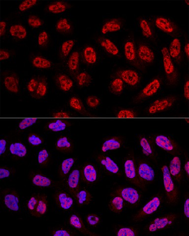 Confocal immunofluorescence analysis of U2OS cells using SF3A3 Polyclonal Antibody at dilution of 1:100. Blue: DAPI for nuclear staining.