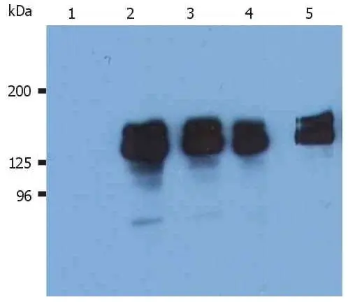 WB analysis of THP-1 cells using GTX79894 SHIP1 antibody [SHIP-01]. Lane 1 : mouse IgG1 isotype control Lane 2,3 : GTX79894 Lane 4,5 : GTX79893